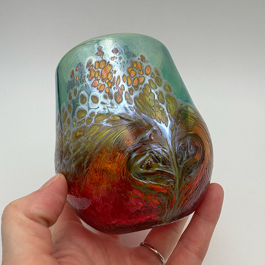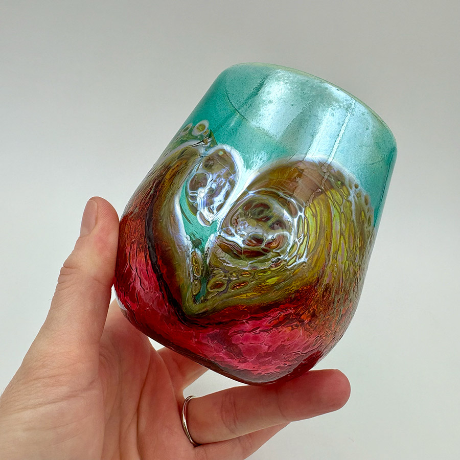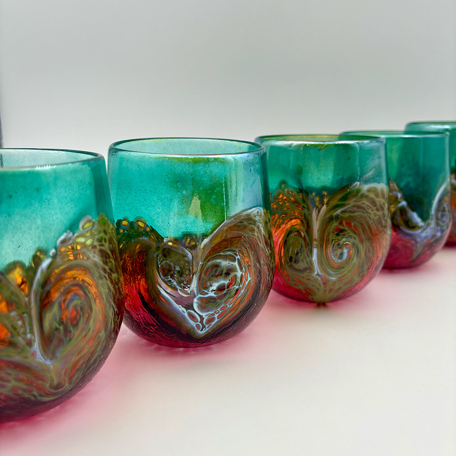 Each unique glass is lovingly made by hand, and therefore, may exhibit subtle variations in height, width, and color, adding to their artisanal charm. They are signed and dated.